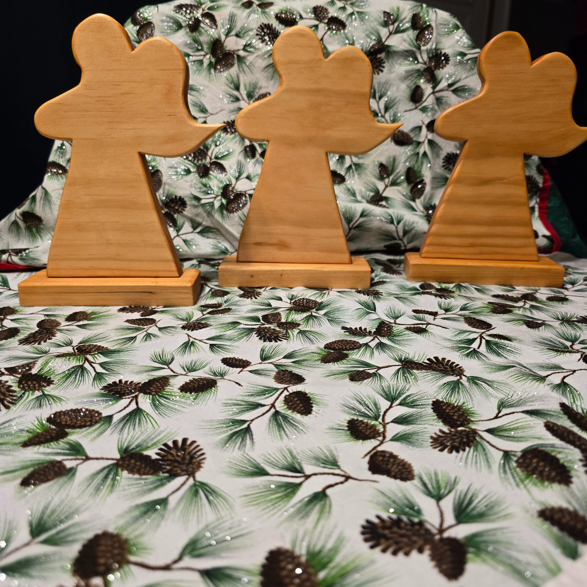 Bring peaceful Christmas charm into your home with this set of rustic 8 1/2" tall wooden angels. Each angel is carefully handcrafted, sanded smooth, and finished to highlight the natural wood grain. Perfect for farmhouse holiday décor, mantel styling, nativity scenes, and winter decorating.