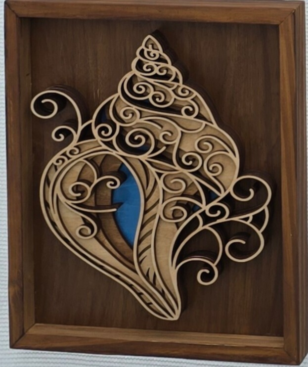 This CONCH SHELL is a unique and intricately designed piece, featuring multilayered wood, hand painted details, and a beautiful stained finish. Its delicate craftsmanship and striking colors make it a stunning addition to any home decor. Made with high-quality materials, it is sure to be a conversation starter and a timeless piece to treasure.
