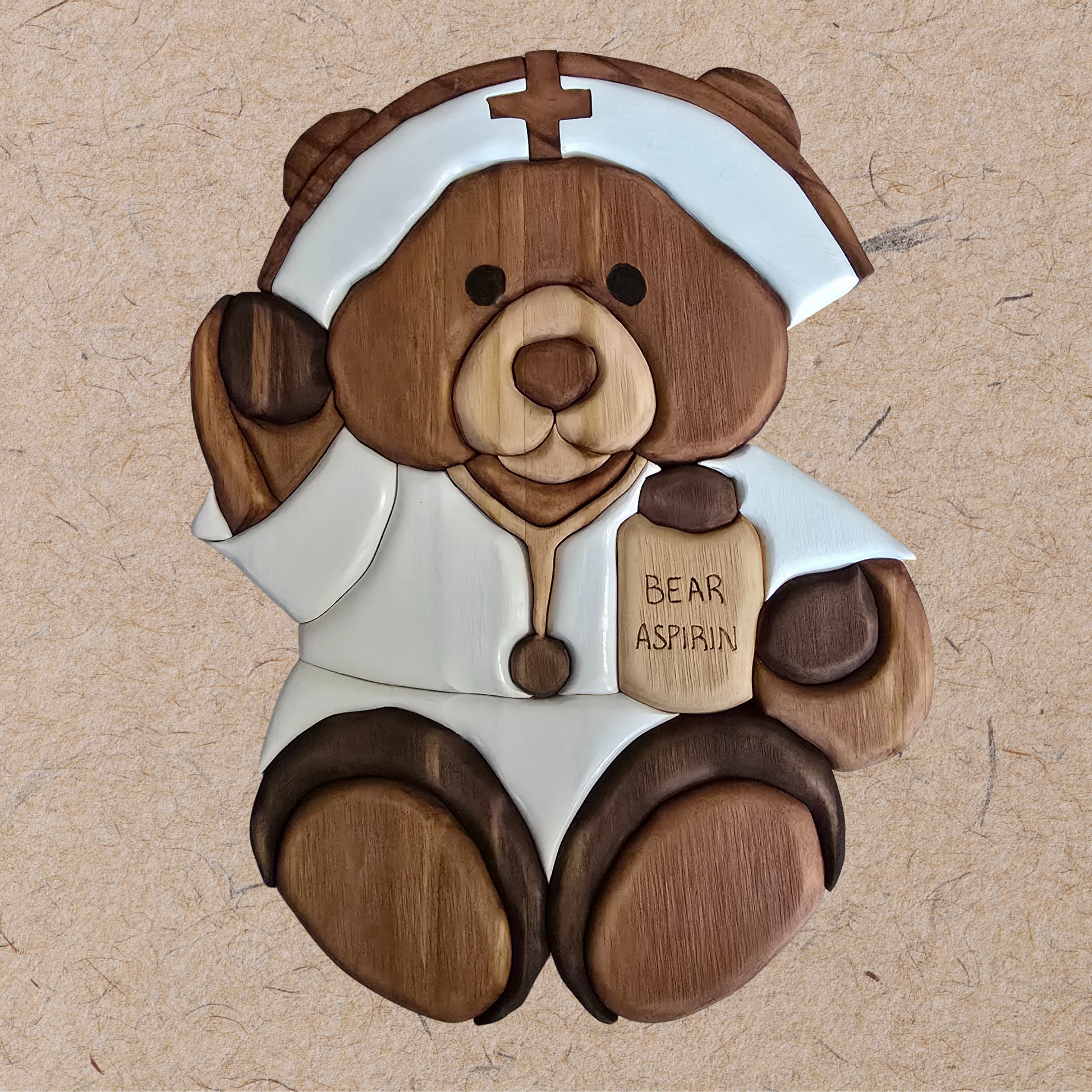 Healing Paws is a handcrafted intarsia nurse bear holding a tiny bottle of ‘Bear Aspirin.’ Unique layered wood art that celebrates care and compassion — a perfect gift for nurses, healthcare heroes, or anyone who loves handmade art with heart