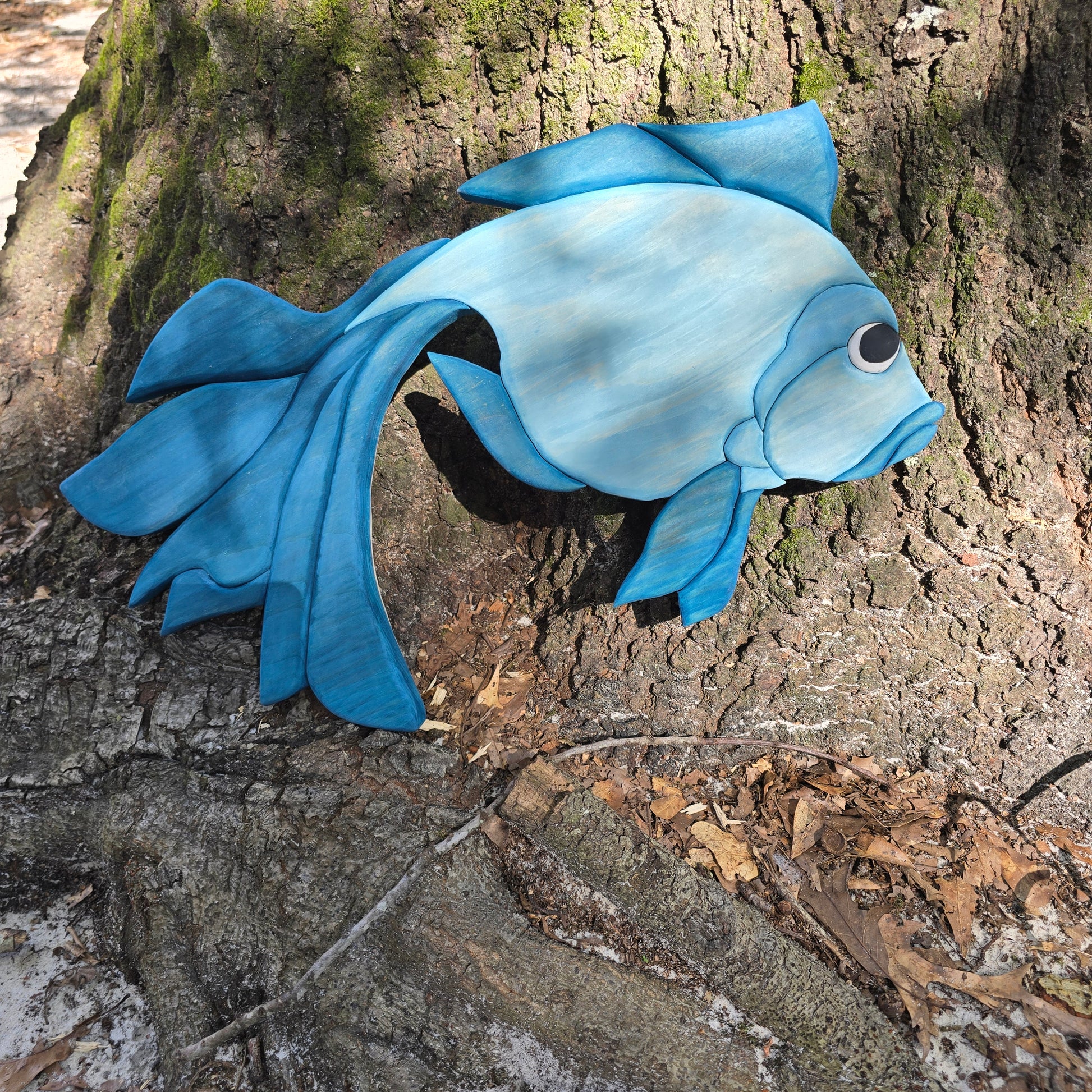 Handcrafted intarsia fish wall art made with scroll saw precision and hand-stained in layered shades of blue. Unique wood décor perfect for coastal homes, lake houses, or anyone who loves aquatic-inspired design.