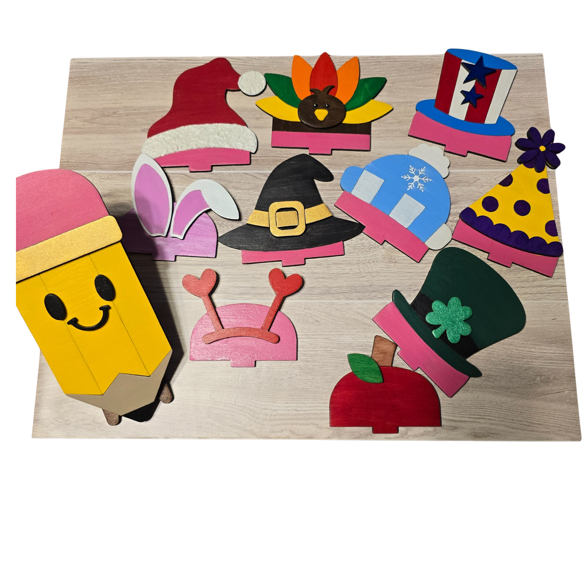 “Hand-painted wooden pencil décor with interchangeable holiday and seasonal hats. Fun and versatile classroom, teacher, or home décor that celebrates every season.”