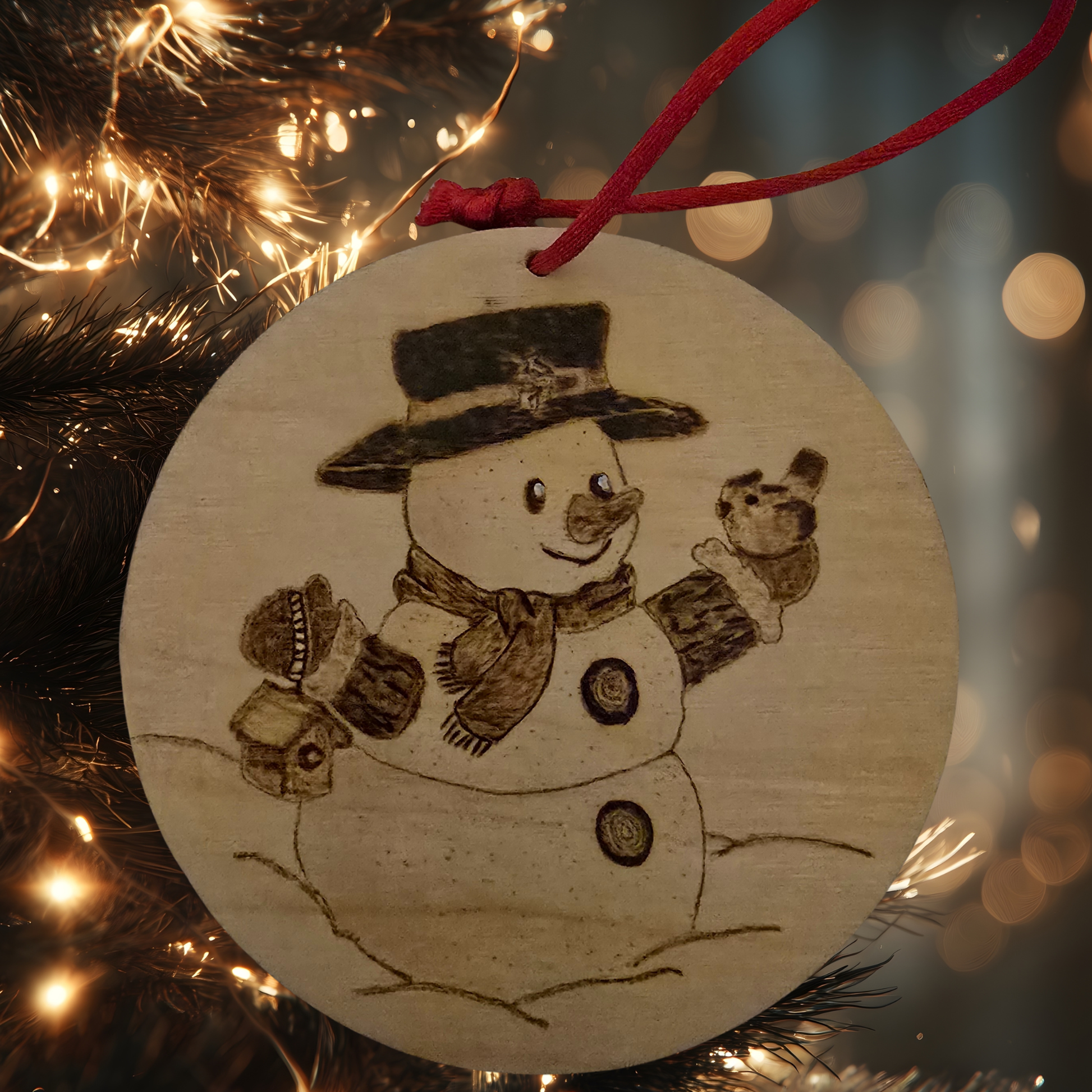 Celebrate the magic of winter with Snowday Companion, a handcrafted pyrography ornament featuring a cheerful snowman sharing a quiet moment with his tiny bird friend. Every line is wood-burned by hand, giving this piece its warm, rustic character and charming vintage feel.
