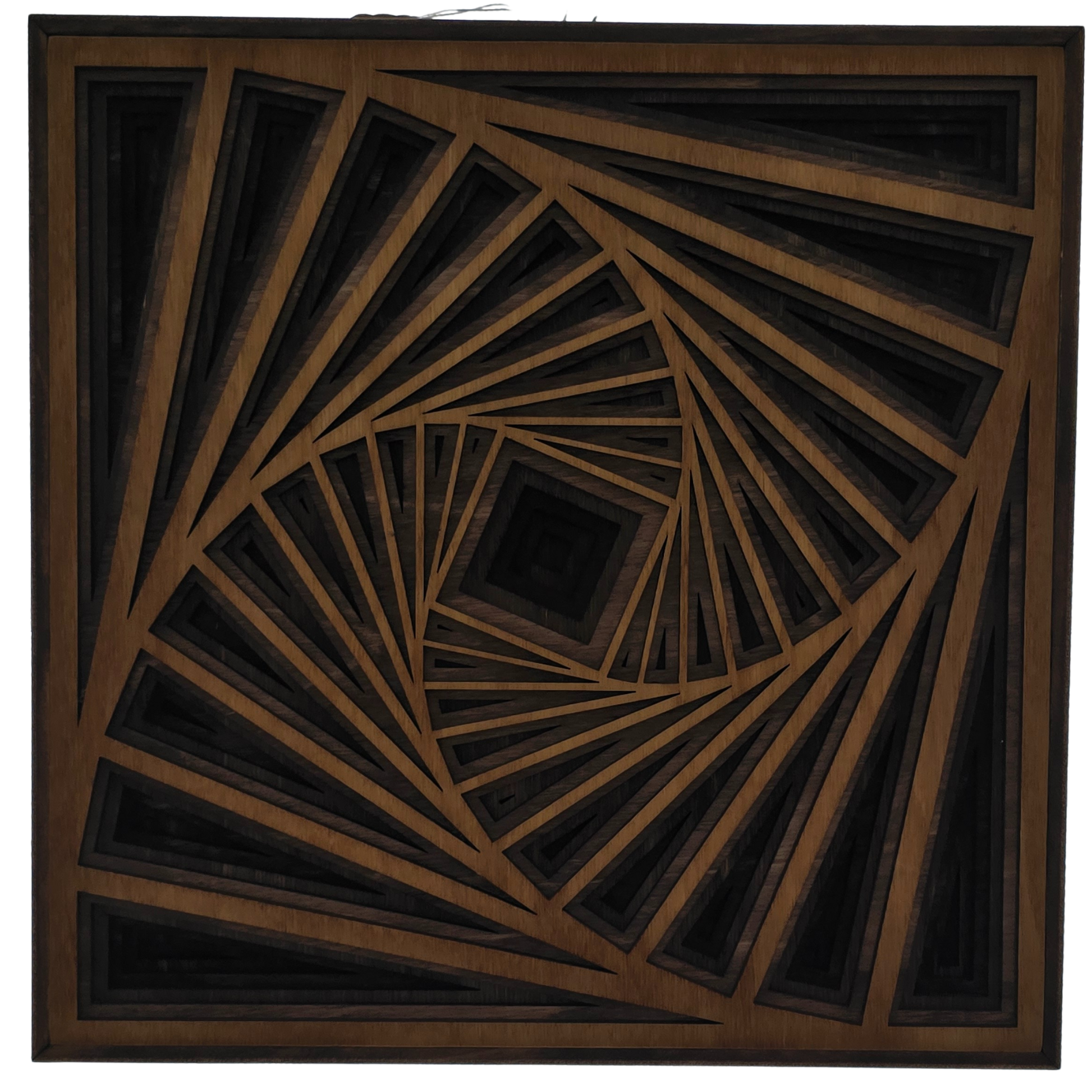 Elevate your space with this striking multilayered wooden wall art, designed with precision-cut angles that create a mesmerizing spiral effect. Each layer is scroll-sawn, hand-sanded, and hand-stained to highlight depth, texture, and bold contrast. The result is a modern, dimensional piece that feels both artistic and architectural.